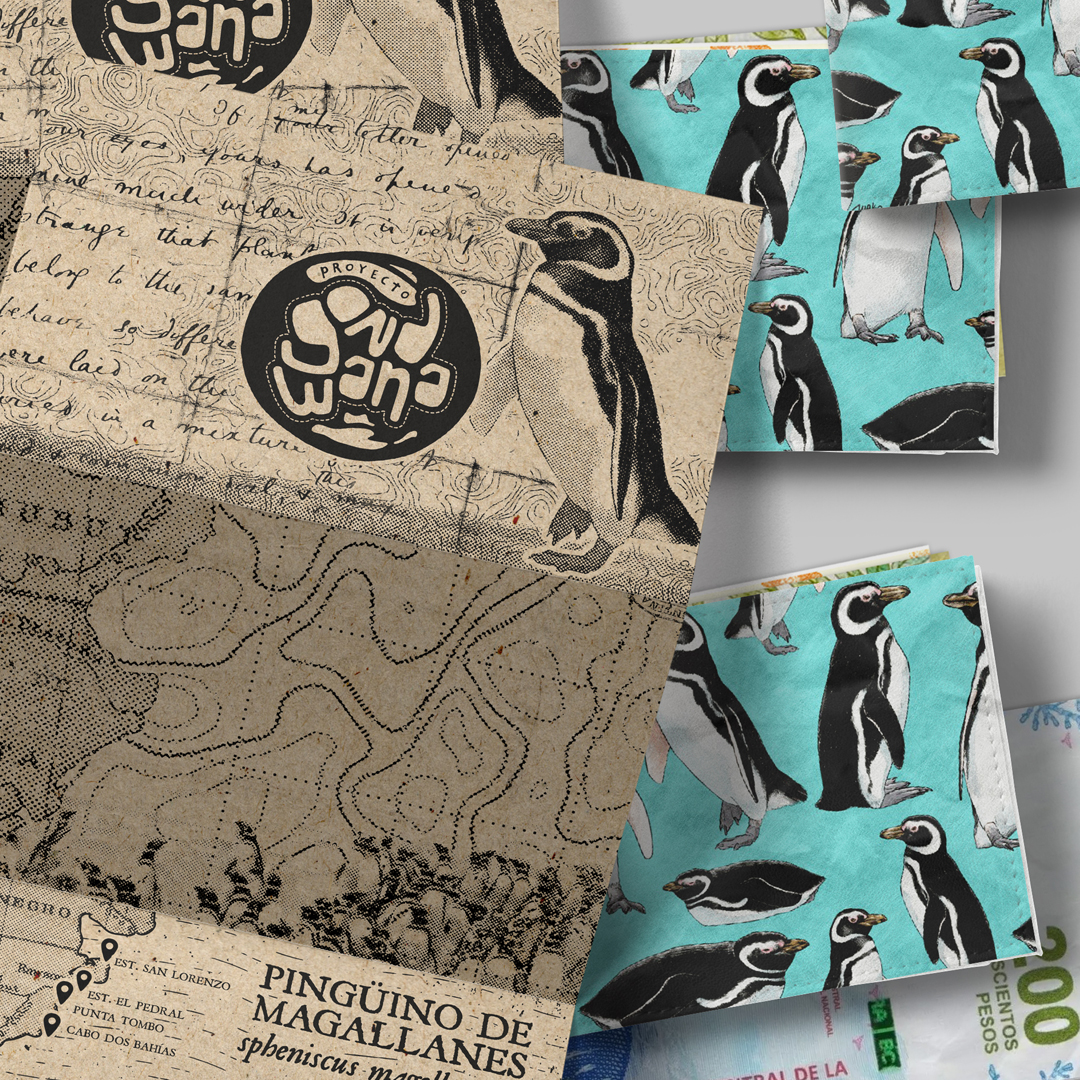 Billetera de Tyvek, resistente a la Patagonia. Con data de pingüinos que ni ellos sabían. Dibujada por Ellon Mark